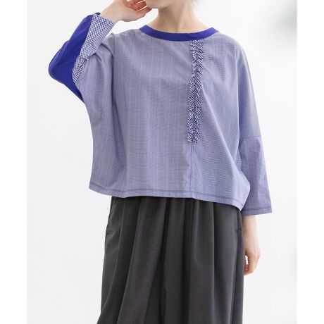 3種類の布帛生地を、前身頃と前袖にパッチワークのようにはめ込んだ、さりげないデザイン性のあるトップス。フロントの切り替えには小さなフリルを添えて、甘すぎない可愛らしさをプラスしました。後ろ身頃には、柔らかく薄手のUSコットン天竺を使用。動きやすく、肌ざわりも軽やか。袖は肩をなだらかに覆うドルマンスリーブで、長すぎない丈感が、きれいにバランスが取れたシルエットに。衿ぐりはラフなバインダー仕様で、ほどよくカジュアルに仕上げました。