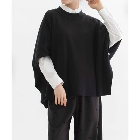 12ゲージ総針編みで仕立てた、レーヨンポリエステル素材のワイドベスト。毛玉になりにくく、お手入れが簡単な通年アイテムです。ワイドな身幅でポンチョのように羽織れるデザインは、さらっと合わせるだけでこなれ感を演出。しっかりとした太めの衿がアクセントになり、脇はボタン留めでラフに着られる仕様です。前後差のある裾は、後ろをやや長めに仕上げ、横から見てもバランスよく決まります。編み機すべての針を使った総針編みは、手間と糸を惜しまず使用しているため、しっかりとしたハリ感と上品な目の詰まりが特徴。光沢のあるレーヨン糸にポリエステル糸を添えてプレーティングすることで、美しい表情と型崩れしにくい仕上がりになっています。