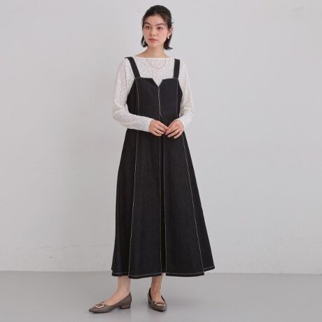 THESHOPTK定番のデニムジャンスカは、ワンウォッシュ加工を施したネイビーとブラックの2色展開が魅力。