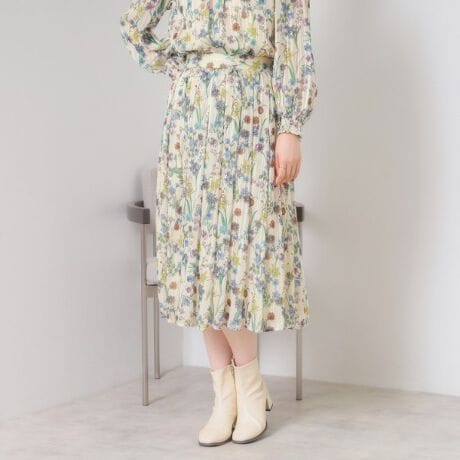 繊細なラメが輝くシアーストライプ生地に、花柄をプリントした華やかなスカート。