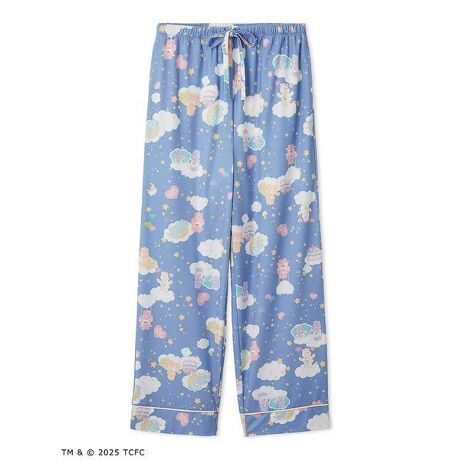 星が瞬く夜空で、描き下ろしの5匹のケアベアたちがくつろぐ総柄プリントのパジャマシリーズです。