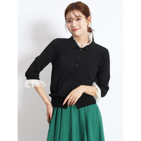 裾と袖のふんわりとしたフリルがアクセントになった大人のカーディガン。