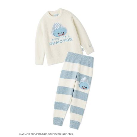 「ドラゴンクエスト」シリーズのモンスターたちが、眠っている姿を描いた’ベビモコ’素材のキッズサイズのセットアップ。もっちりとした柔らかいプルオーバーに、ナイトキャップをかぶったスライムのアートをあしらいました。ジェラート ピケらしいボーダーのロングパンツは、動きやすい裾を絞ったシルエット。左脚にプルオーバーと同じモンスターのジャガードが入っています。お揃いのアイテムも展開しているので、ファミリーで揃えて冒険気分をお楽しみいただけます。