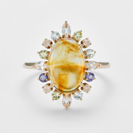柔らかな色合いのアンバーを主役に、あえてダイヤモンドではなくペールトーンの天然石で取り巻いた、アガットらしい感性が光るリング。優しい色彩と繊細な輝きが調和し、アンティークな雰囲気の中に、静かな華やかさを添えています。日常のスタイルにそっと寄り添いながら、耳元にやわらかなニュアンスをもたらすアイテムです。※天然石や天然素材を使用しているものは、サイズ・色味・風合いの違いや、若干の傷、内包物の有無などに個体差があります。予めご了承ください。※アンバーは爪留め(のり併用)ですので水分にはご注意下さい。※サイズ直し不可。