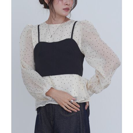 シアー感のあるドットブラウスと、ブラックのビスチェを組み合わせた華やかなSETアイテム。ブラウスはほんのり透ける素材感が女性らしく、袖にはギャザーを寄せることでふんわりとした立体感を演出。ビスチェを重ねることで甘さの中にメリハリが生まれ、大人っぽいフェミニンスタイルが完成します。ブラウスはアイボリー・ベージュ・ブラックの3色展開で、それぞれ異なる雰囲気を楽しめるのも魅力。アイボリーは軽やかで柔らかな印象に、ベージュは落ち着きのある上品な雰囲気に、ブラックはシックでクラシカルな着こなしに。特別感のあるデザインながらも、セットで着るのはもちろん、単品使いもできる着回し力の高い一枚です。