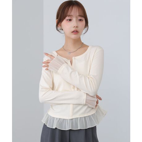 なめらかで伸縮性のある着心地が特徴。柔らかく体に沿う素材感でストレスフリーに着られます。フリル部分は、軽やかで形がきれいに出やすい質感です。