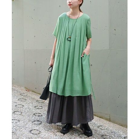 ボディラインを拾わないシルエットで、ウエストリボンがさらにきちんと感を演出します。