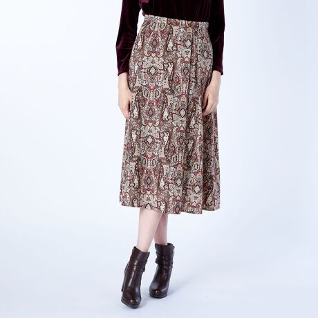 サラサプリント柄が着こなしのアクセントになる華やかなロング丈スカート。細かなディテールの柄が目を惹くデザイン。タック入りで自然なドレープのあるフレアなシルエット。すっきりと着こなせるサイドジップ仕様。お手持ちのトップスに合わせておしゃれなお出かけコーディネートが完成する便利なアイテムです。