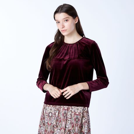 光沢感のあるベロア生地で仕立てたエレガントな長袖カットソー。ストレッチ素材で身体の動きにフィットし、着心地も快適。首元のタックで出来るフロントのナチュラルなドレープ感がフェミニンなデザインディテール。シンプルなデザインで様々なスタイルのボトムと好相性。シックなお出かけスタイリングが叶う一枚です。