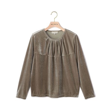 光沢感のあるベロア生地で仕立てたエレガントな長袖カットソー。ストレッチ素材で身体の動きにフィットし、着心地も快適。首元のタックで出来るフロントのナチュラルなドレープ感がフェミニンなデザインディテール。シンプルなデザインで様々なスタイルのボトムと好相性。シックなお出かけスタイリングが叶う一枚です。
