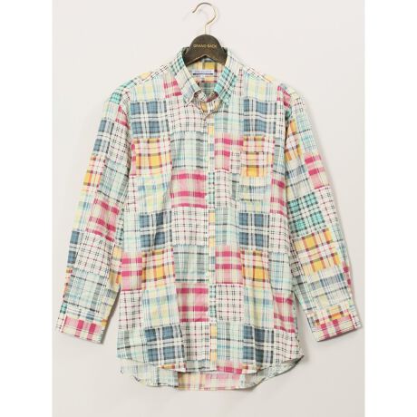 着映え度抜群、コーディネートの主役になるボタンダウンの長袖シャツです。古着のようなパッチワーク風のチェック柄プリントで、上品な大人カジュアルを楽しめます。左胸ポケット付きで利便性にも優れています。