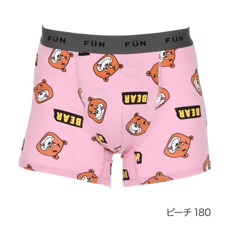 ピンクの生地にまっるとしたクマの顔がかわいい前閉じのボクサーブリーフです。伸縮性のあるベア天竺素材を使用しており、ストレッチのきいた快適なフィット感です。POPで個性的なデザインなので、おしゃれなインナーアイテムとしてプレゼントにもおすすめです。