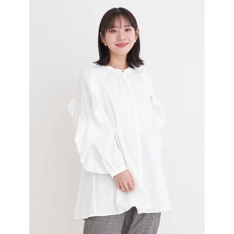 袖のラッフルフリルとフレアシルエットがフェミニンなムードを纏うチュニックブラウス。