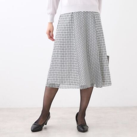 万華鏡のような楽しさのあるモチーフで、幾何柄の知的さも感じられるオフィスにもぴったりなプリントスカートです。