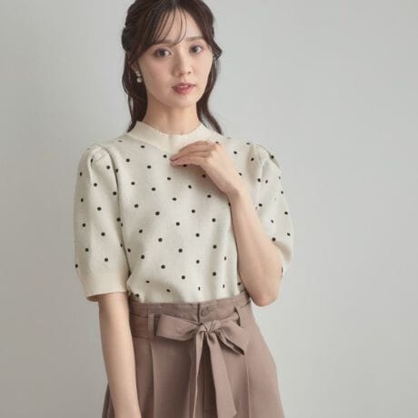 レーヨン混の程よい肉感のドットジャカード編みがポイントの半袖デザインニット。