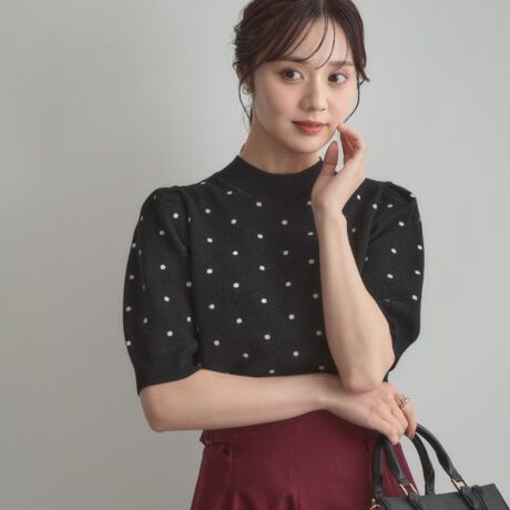 レーヨン混の程よい肉感のドットジャカード編みがポイントの半袖デザインニット。