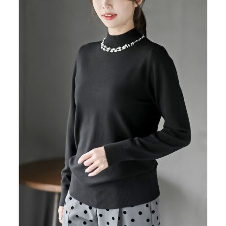 パールビジューネックハイネックニットプルオーバー