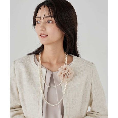 ・パール調の二連ロングネックレスと小ぶりなサイズ感が上品なコサージュ