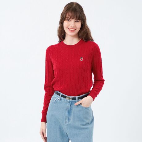 胸元のワッペンがアクセントのクラシックなケーブルニットプルオーバー。