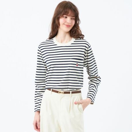 オリジナルキャラクターのベアのワッペンがワンポイントの、ベーシックな長袖のボーダーカットソー。