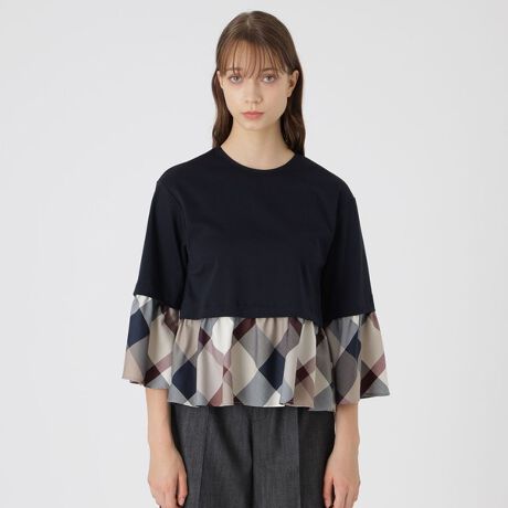[型番:55P07626__]◆大胆なフリルがポイントのデザインカットソー【Design】袖口と裾の大胆なフリルがポイントのデザインカットソーです。一枚さらっと着用するだけでコーディネートが映える主役アイテムです。ウエスト周りはゆとりがあり、お腹周りもさり気なくカバーするシルエットです。パンツとのコーディネートがおすすめです。