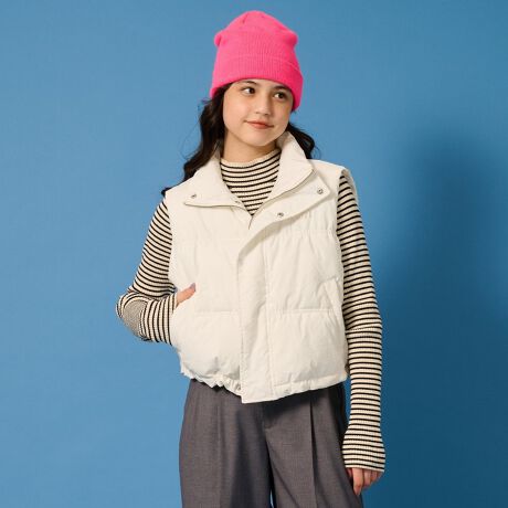 季節の先取りにぴったり!白と黒の2色展開の中綿ベスト。