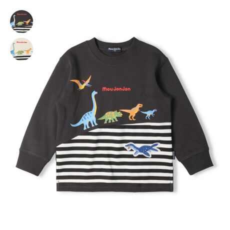 秋から春まで長く着られる裏毛素材のトレーナー、スウェット。無地とボーダーの切替デザインがお洒落!男の子が大好きな恐竜のプリント入り!ボーダー部分の恐竜はワッペンになっているのもポイント!【アイテム】トップス カジュアル お洒落 オシャレ かっこいい かわいい 可愛い 普段着 デイリーウェア お出かけ着 お外着 お外遊び着 子ども服 こども服 男児 男の子 ボーイズ キッズ ベビーサイズ トドラーサイズ 幼稚園 保育園 小学校 通園 通学 小学生 2025年秋冬物新作 丸高衣料 ロングスリーブ 長袖 黒色 ブラック オフホワイト 白色 ムージョンジョン コットン100% 綿100% ティラノサウルス トリケラトプス プテラノドン プレシオサウルス ムージョンジョン ダイナソー