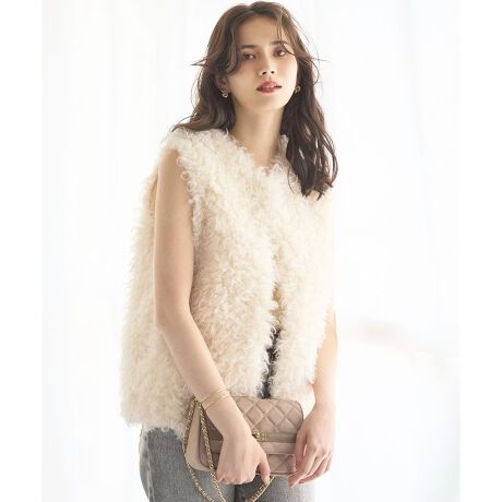 ランダムにカールしたボリュームのある毛足が魅力の、フェイクファージレ。パンツやワンピースに合わせやすいよう考えられた絶妙なレングスバランスで、シンプルなコーデにプラスするだけで旬なスタイリングが楽しめます。優しい印象で淡い色とのコーディネートがオススメのアイボリー(#002)とニュアンスのある色味がお洒落なブラウン(#030)の2色展開です。