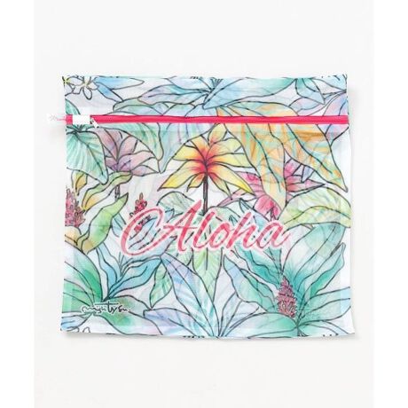 [型番:YCVP5301-2025]マウナロアオリジナルデザインと人気の'Mighty Su'アートが描かれたランドリーポーチ。全面にプリントしたトロピカルなアートが特徴。摩擦によるシワや型崩れを防ぎ、大切なフラアイテムの魅力を保ちます。レッスン後のTシャツなどを入れてそのまま洗濯機へ入れられます。紙帯付きで、フラライフを送るオハナへのプレゼントにも最適です。