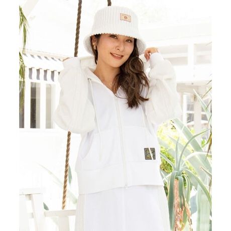 フードと袖に立体感のある編み柄生地を使用したフードパーカー。背中は刺しゅうとフロッキープリントを組み合わせたデザイン。スポーティーなデザインでアクティブシーンにもぴったり。裾にフィット感があるすっきりとしたシルエット。スカートとのセットアップコーデもおすすめ。