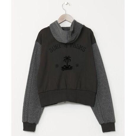 フードと袖に立体感のある編み柄生地を使用したフードパーカー。背中は刺しゅうとフロッキープリントを組み合わせたデザイン。スポーティーなデザインでアクティブシーンにもぴったり。裾にフィット感があるすっきりとしたシルエット。スカートとのセットアップコーデもおすすめ。