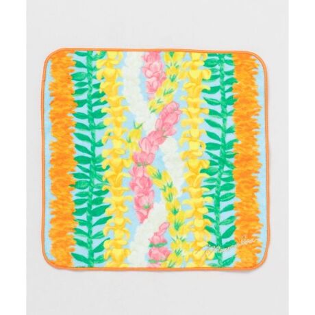 [型番:YBMP5301-2025]メロー刺繍でふちどられ、カラフルなレイがプリントされたタオルハンカチ。表地は柔らかな肌触り、裏面はパイル地で吸水性の良い一枚。ゴールド刺繍のマウナロアロゴがアクセント。