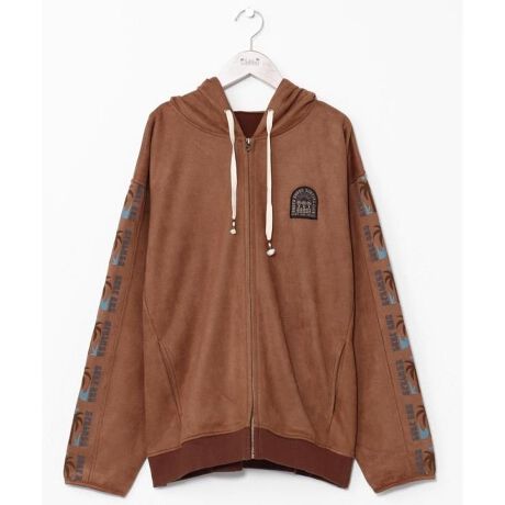 [型番:46R-5308-2025]やわらかい肌触りのフェイクスエード素材のメンズフードパーカー。袖口にヤシの木がプリントされたサーフテイストな一枚。袖口のパイピングがアクセントになっています。軽い着心地で季節を問わず着用できます。