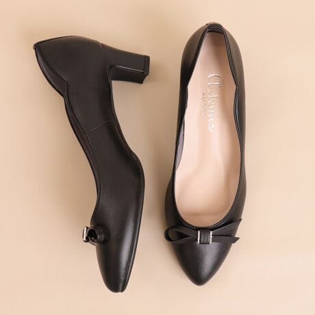 ・クリスタルパーツがキラッと輝くアシンメトリーミニリボンがレディライクなパンプス。