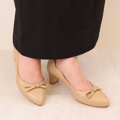 ・クリスタルパーツがキラッと輝くアシンメトリーミニリボンがレディライクなパンプス。