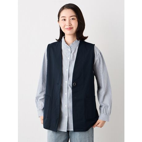 [型番:6250100]すっきりとしたVネックのシンプルなベストアイテム。衿元はすっきり見せ、気になるお腹周りをカバーしてくれる着丈68c丈です。秋はインナーにベーシックなカットソーやブラウスを合わせて季節をつなぐアイテムとして、肌寒い日は軽めのアウターを羽織って重ね着もお楽しみいただけます。