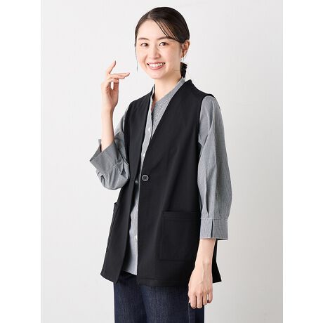 [型番:6250100]すっきりとしたVネックのシンプルなベストアイテム。衿元はすっきり見せ、気になるお腹周りをカバーしてくれる着丈68c丈です。秋はインナーにベーシックなカットソーやブラウスを合わせて季節をつなぐアイテムとして、肌寒い日は軽めのアウターを羽織って重ね着もお楽しみいただけます。