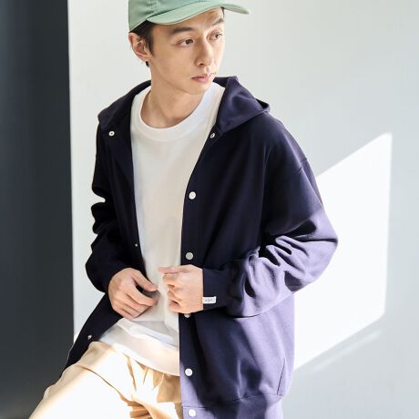 シンプルに見えて、実は機能付き。さっと羽織れるスナップボタンパーカー