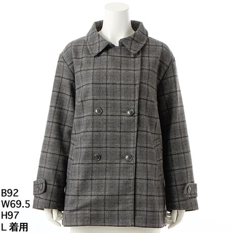 [型番:5700601]ウールの様に見えるチェック柄のフェイクウール生地を使用。Pコートの型をアレンジしてチェスターコートとの中間の衿に仕上げました。第一ボタンまで閉めても首回りが苦しくならない様にしているので、閉めて着てもかわいいです。ヒップ下の短め丈なのでスカートやワイドパンツに合わせても重くなりにくいです。グリーンノート 大きいサイズ レディース ゆったり コート チェック