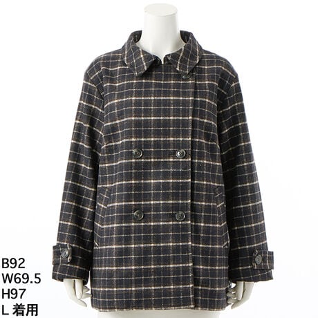 [型番:5700601]ウールの様に見えるチェック柄のフェイクウール生地を使用。Pコートの型をアレンジしてチェスターコートとの中間の衿に仕上げました。第一ボタンまで閉めても首回りが苦しくならない様にしているので、閉めて着てもかわいいです。ヒップ下の短め丈なのでスカートやワイドパンツに合わせても重くなりにくいです。グリーンノート 大きいサイズ レディース ゆったり コート チェック