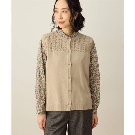[型番:492806]柄編みの切り替えが表情感を演出するニットベスト前開きのデザインでスタイリングに抜け感を演出するニットベスト。裾の長さは前後で異なるので、サイドから見てもすっきりとした印象を与えます。丸みのあるクルーネックの襟元が魅力的。休日のお出かけシーンに大活躍してくれるアイテムです。