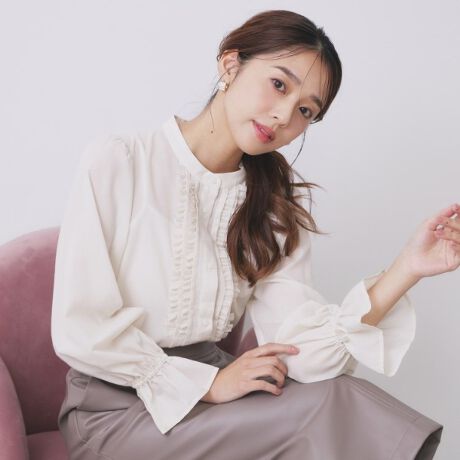 細やかなタックフリルが華やかなバンドカラーブラウス