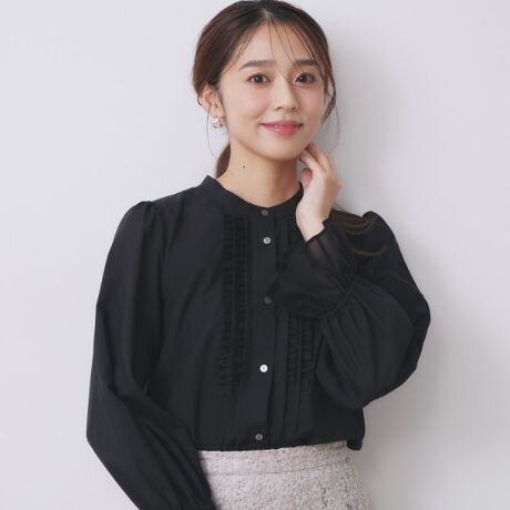 細やかなタックフリルが華やかなバンドカラーブラウス