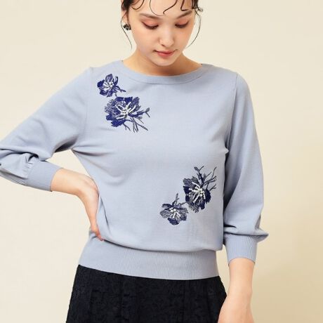 機械刺繍とパール調・ビーズの手刺繍を組み合わせて、大花を大胆に配したSunauUnaらしい華やいだニットプルオーバーです。