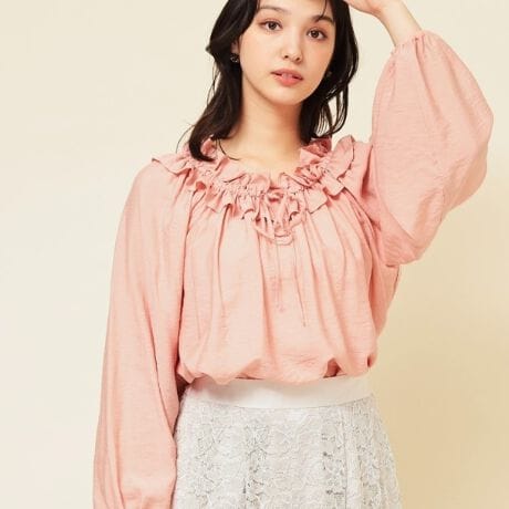 衿元のギャザーとリボンが華やかで女性らしさ溢れるブラウス。
