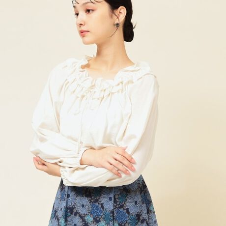 衿元のギャザーとリボンが華やかで女性らしさ溢れるブラウス。