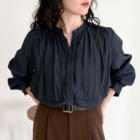 ・柔らかな光沢感が上品なサテン素材の前開きブラウス