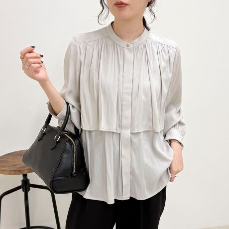オンオフ活躍する前開きサテンブラウス