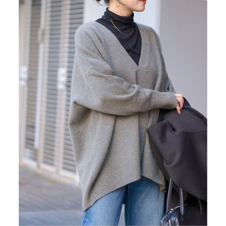 カシミヤ混の、もっちりとした柔らかい手触りの素材。1枚着でも、ジャケットやアウターのインでも使いやすい肉感。ざっくりと深めに設定したVネックが今年らしいデザインで、着丈がしっかりあり、身巾をとても大きくした、ポンチョのようなシルエットで着ごたえのある1枚にしあがっています。