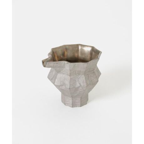 皺をつけた紙のパーツを組み合わせて形を作り、それをもとにつくった石膏型を使用し、紙の質感がそのまま現れています。紙が見せる一瞬の表情を、磁土という半永久的な素材に写し取っています。【金井悠】